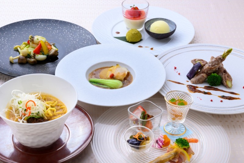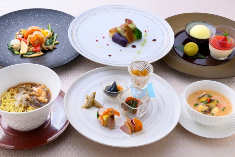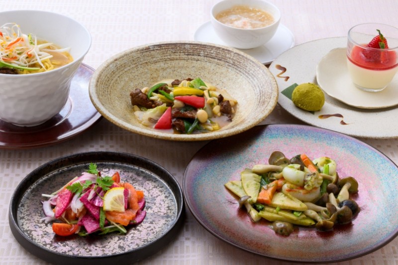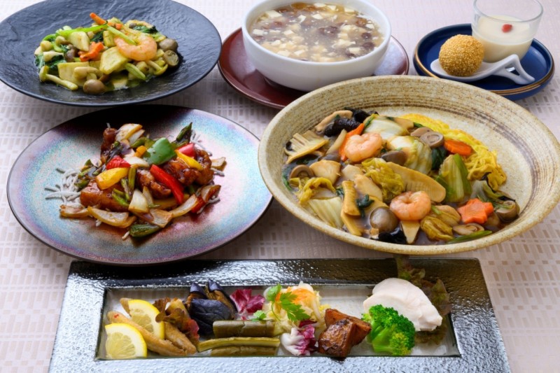 旬の味覚を盛り込んだ前菜に始まり、やわらかな鮑を忍ばせた茶碗蒸しに、蟹肉のあんを贅沢にかけた上品な一皿。大海老とベビー紋甲イカのX.O醤炒めは、香ばしさと深みのある旨みが広がります。国産牛ロース肉は烤鴨餅(カオヤーピン)に包み、トリュフ香る塩で洗練された味わいに。締めにはフカヒレあんかけスープそばを、デザートには苺入り杏仁豆腐と抹茶きな粉団子をご用意。華やかさと繊細さを併せ持つ中華コースです。